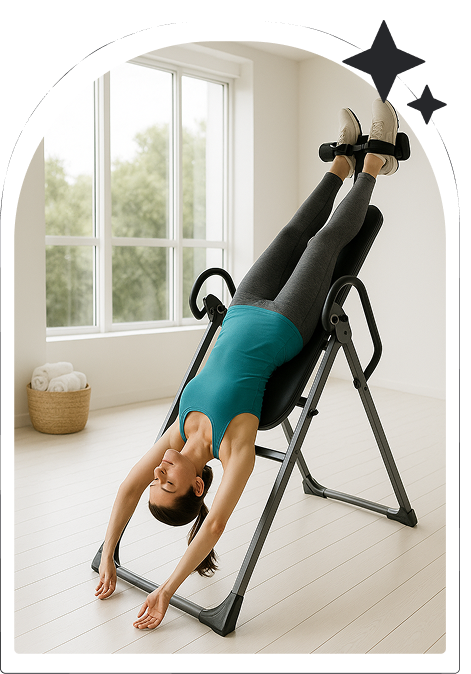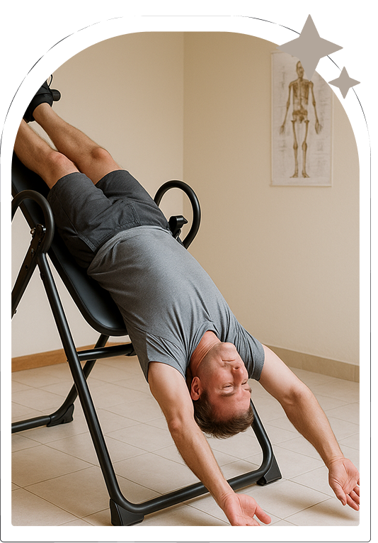 טיפול חדש באמצעות מיטת היפוך: מתיחה עדינה לאורך הגוף בעזרת כוח הכבידה שמפחיתה לחץ מהדיסקים ומהעצבים ומקלה על כאב. משולב עם נשימה עמוקה והנחיה מדורגת, לחזרה לתחושת קלילות, אורך ומרחב בתנועה.